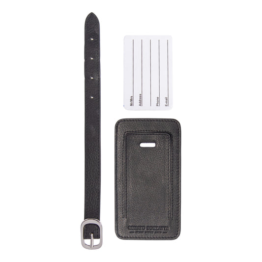 RB0054A | Targhetta per bagaglio in Vera Pelle pieno fiore con leggera grana. Colore Nero. Cinturino regolabile. Dimensioni: cm 6,5 x 12 x 0,5