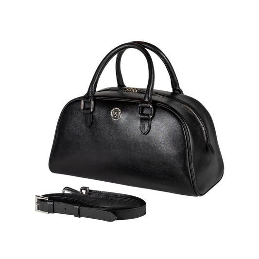 RB1034A | Borsa Bowling da Donna VIRGINIA in Vera Pelle Saffiano Made in Italy. Accessori in metallo Argento Lucido. Colore Nero. Dimensioni: cm 35 x 19 x 14,5 + 12 (Luce manici)