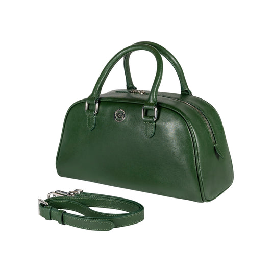 RB1034E | Borsa Bowling da Donna VIRGINIA in Vera Pelle Saffiano Made in Italy. Accessori in metallo Argento Lucido. Colore Verde. Dimensioni: cm 35 x 19 x 14,5 + 12 (Luce manici)