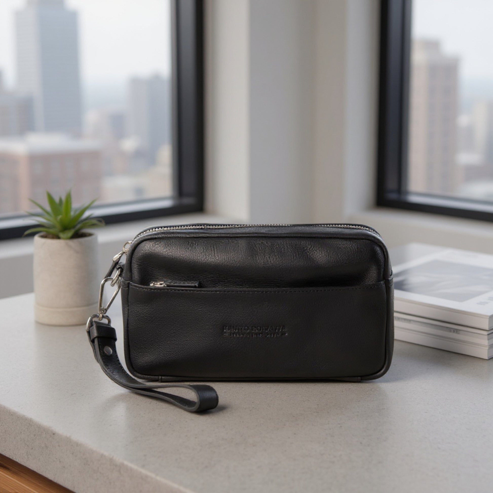 RB0046A | Pochette Uomo KEVIN con laccio da polso in Vera Pelle pieno fiore con leggera grana. Maniglia removibile. Colore Nero. Dimensioni: cm 22 x 13 x 5