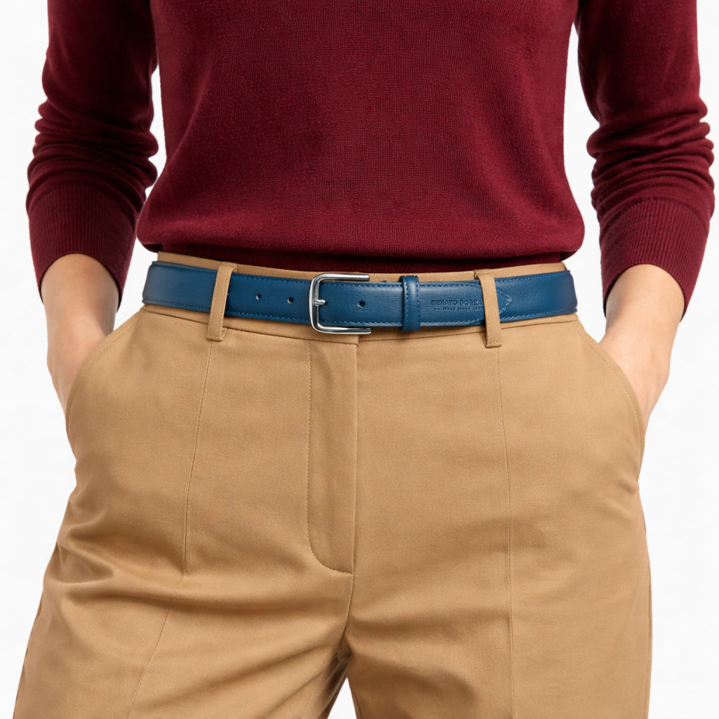 RB4017D | Cintura Donna Made in Italy in Vera Pelle Saffiano. Fibbia in finitura Argento Lucido. Colore Blu. Dimensioni: cm 115 x 3,0 x 0,5 (giro vita cm 100)